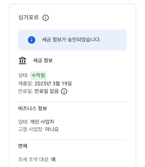 며칠 뒤에, 구글 애드센스 싱가포르 세금정보가 승인되었다고 표시됩니다.