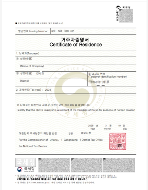 납세자 거주 증명서는 대한민국에서 세금을 내고 있다는 공식적인 증명서로, 국세청에서 발급받을 수 있습니다.