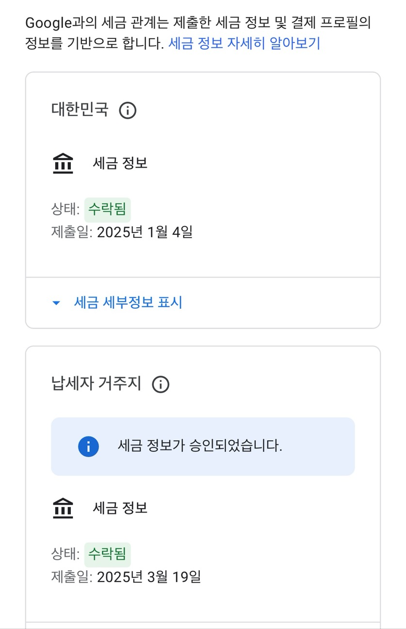 승인 여부는 애드센스 세금 정보 페이지에서 확인할 수 있어요.