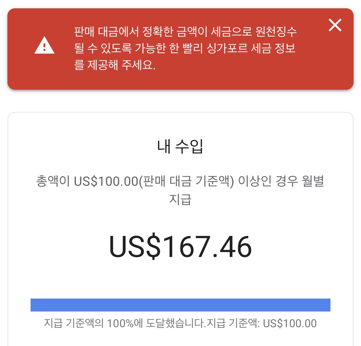구글 애드센스에서 작년에 이어 싱가포르 세금정보를 제공하라고 알림(경고)이 떴습니다.