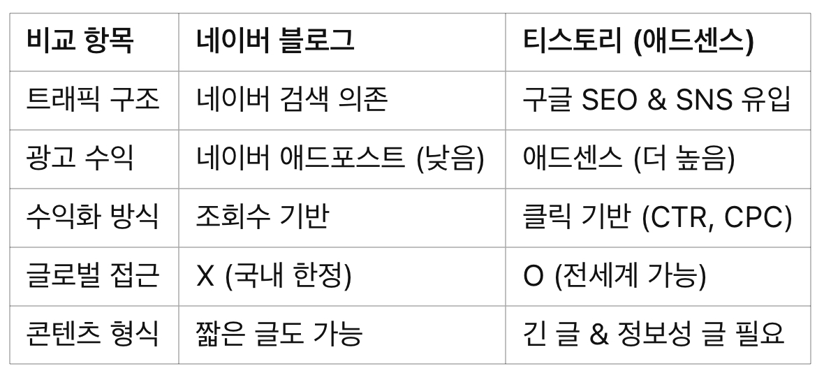 네이버 블로그는 트래픽을 확보하기 쉽지만 광고 수익이 낮고, 티스토리는 트래픽 확보가 어렵지만 광고 수익이 높습니다.